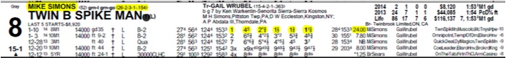 out, now winning at an 8% clip, Simons guided Twin B Spike Man to a 3-1 upset, returning $65.80 to