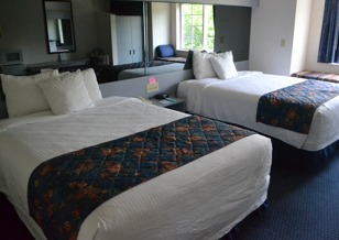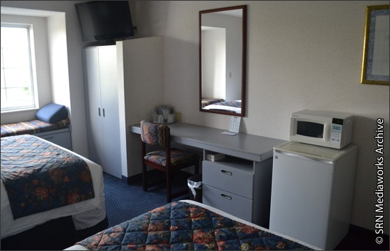 The standard two bed room contains a flat screen television that is in a bit of an awkward angle