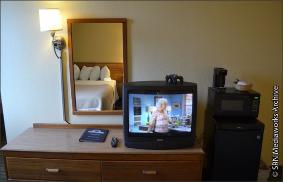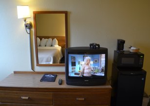 including the desk and dressers were still from a previous era. A tube television still graces