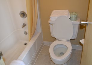 The bathroom was a whole other work of art if that's what you could optimistically call it. The