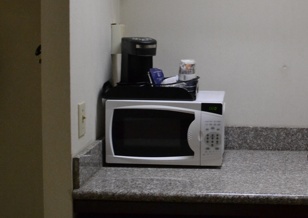 microwave and fridge, plus a bathroom that did not contain a tub but a walk-in shower that made