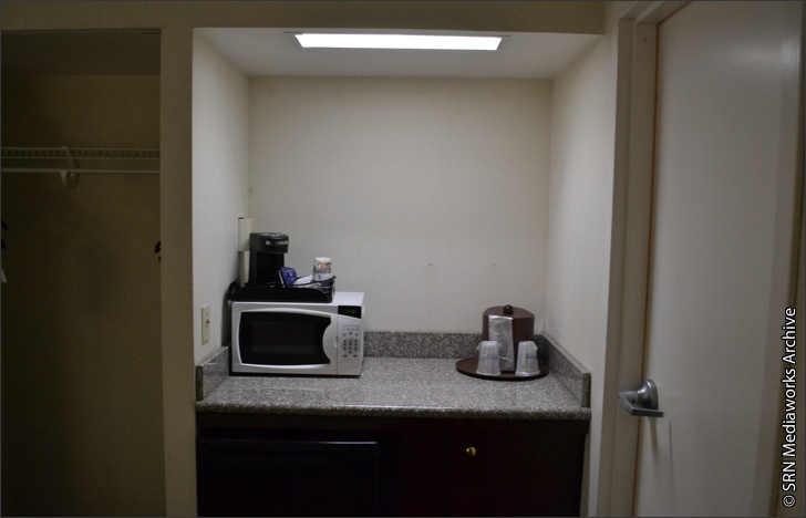 There was also a small desk with the right amount of space for a laptop, a wet bar with a small