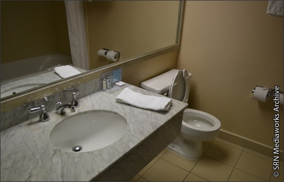 The bathroom shows a bit of age, but thankfully with the normal travel sized bottles of shampoo and