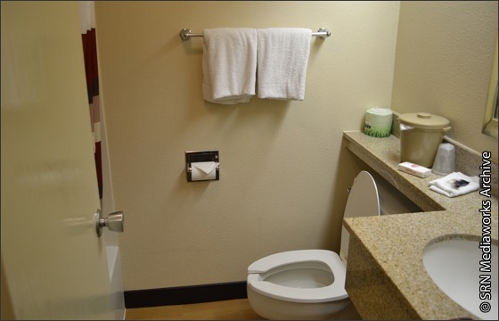 complete with a flat screen TV and a bathroom that looks a little older around the light switches,